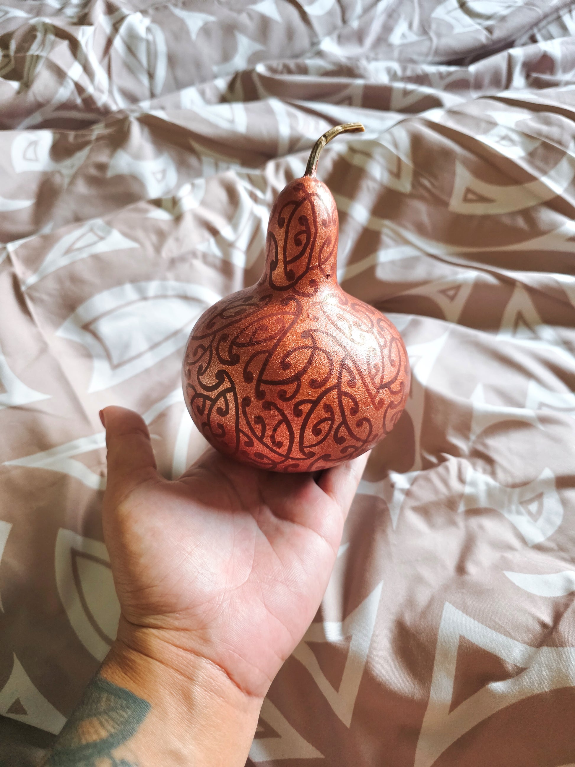 Beautifully handpainted with rose gold copper metalic acrylics then clear Varnish coat.