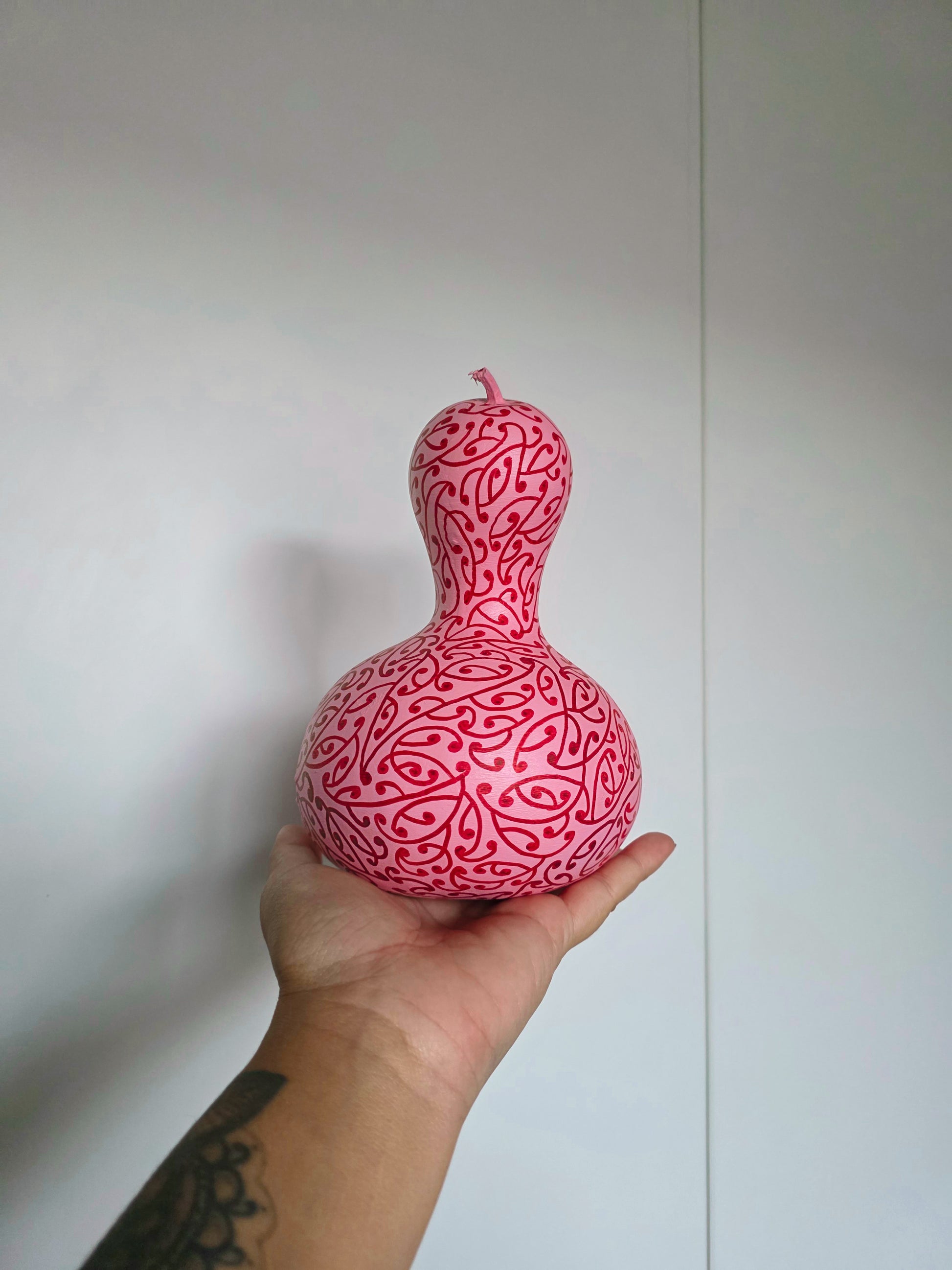 Contemporary hand painted māori pattern, red on pink.