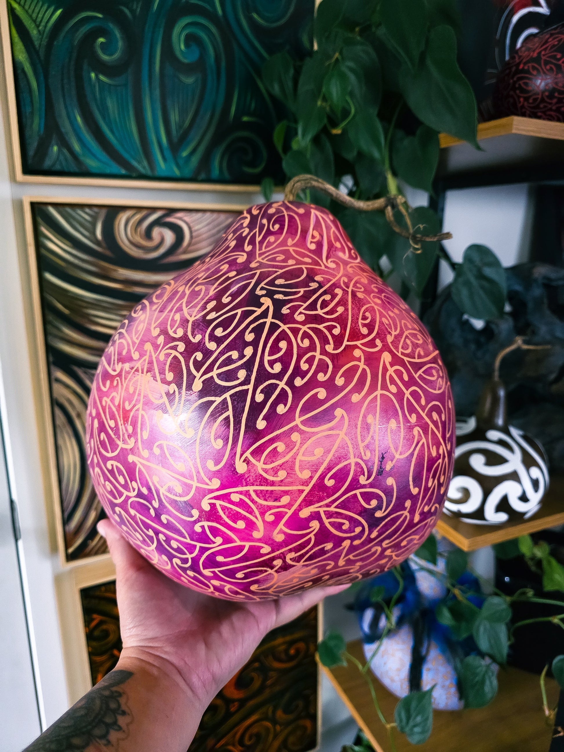 Description: Kangaroo the māori name for spring. This hue is inspired by the colours of the season Spring, warm peach and plum tones with an ambient design throughout this handpainted piece.
